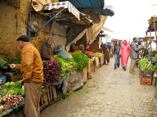 We followed Souad out into the Medina to begin shopping, bumping behind her like empty beer cans on the back of a ‘just married’ car. The narrow, crooked streets were a-flowing with life and vegetables of every kind; tomatoes, fennel seeds, donkeys, humans, cucumbers and cats. The ancient cobbles made for uneasy footwork when you needed it most.